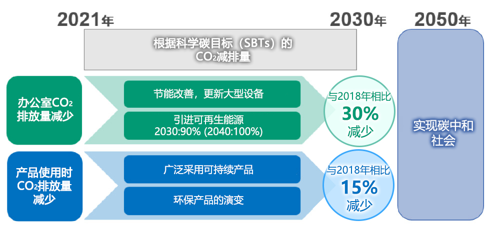 TOTO集团正在努力从长远角度出发减少二氧化碳的排放,旨在实现一个脱碳社会。为了减少其商业据点的二氧化碳排放,TOTO将在节能方面进行改进,升级大型设备,并扩大引进可再生能源,力争到2040年100%使用可再生能源电力(RE100*2成员)。为了减少产品使用时的二氧化碳排放,TOTO将在其产品的环保绩效方面取得进一步的进展,并在全球范围内推广其“可持续产品”系列,即兼顾清洁、舒适和保护环境的独特卫浴产品。这样一来,TOTO将帮助建立一个丰富舒适的社会,对全球化环境更有利。