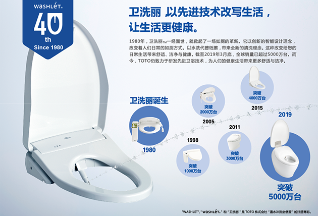 TOTO“卫洗丽”诞生于1980年6月,2019年TOTO“卫洗丽”系列产品全球销量超过5000万台,今年也正式迎来了发售40周年。“纸擦变为水洗”这一革新的如厕方式已经为全世界所接受,人们都希望随时随地的享受温水清洗坐便器带来的洁净生活。