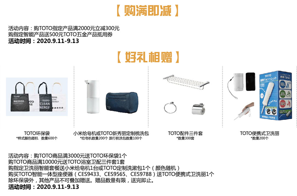 09月11日至09月13日期间,购买TOTO指定商品每满2000元立减300元(具体参加活动商品,请询店内)