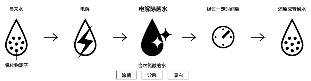 普通生活用水经过电解后形成电解水,电解水所含的次氯酸成分,具有除菌作用,整个过程不添加任何化学品和清洁剂。随着时间的推移,电解除菌水会恢复为普通水,自然、环保。