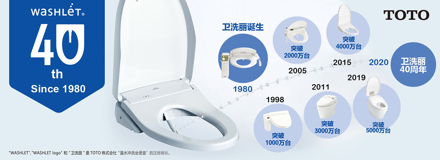 TOTO“卫洗丽”诞生于1980年6月,今年正式迎来发售40周年。在日本,包括“卫洗丽”在内的温水冲洗电子坐便器占有率已达80.2%(2020年3月日本内阁府调查),这类产品已成为人们日常生活中不可或缺的产品。