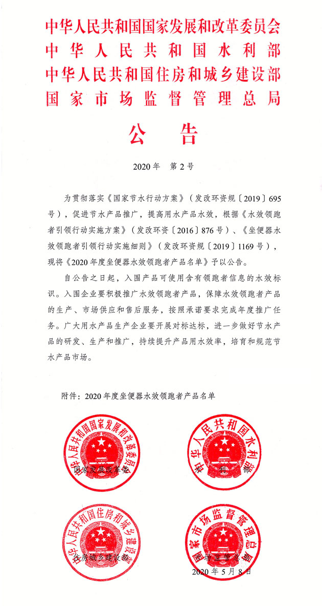 近日,国家发展改革委、水利部、住房城乡建设部、市场监管总局联合发布了《2020年度坐便器水效领跑者产品名单》公告,TOTO多款坐便器从众多参与评选产品中脱颖而出,荣获“坐便器水效领跑者”称号。TOTO也是本次评选中,唯一单冲式、双冲式产品均入选的国际卫浴品牌。本次坐便器水效领跑者名单,由国家四部委联合发布,其权威性和指导性显而易见。对于入选品牌来说,“坐便器水效领跑者”称号的获得,即是强大卫浴技术的展示,也是品牌综合实力的体现。