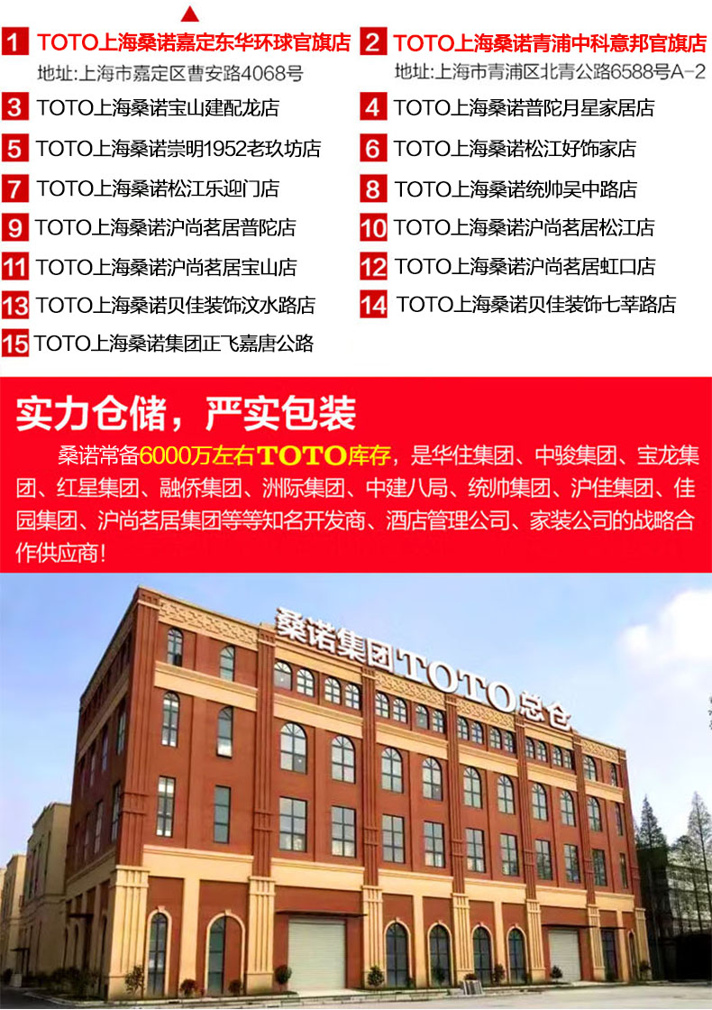 桑诺集团常备6000万TOTO库存,是阳光城集团、佳兆业集团、中骏集团、宝龙集团、红星集团、融侨集团、华住集团、洲际集团、中建八局、建工集团、统帅集团、沪佳集团、佳园集团、沪尚茗居集团等等知名开发商、酒店管理公司、家装公司的战略合作供应商。