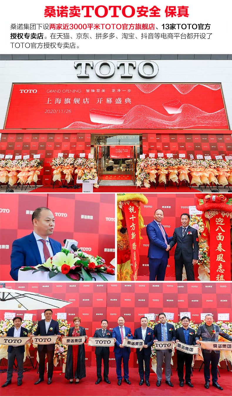 是世界著名品牌TOTO授权经销商。桑诺集团旗下设两家近3000平米TOTO官方旗舰店、13家TOTO官方授权专卖店。在天猫、京东、拼多多、淘宝、抖音等电商平台都开设了TOTO官方授权专卖店。