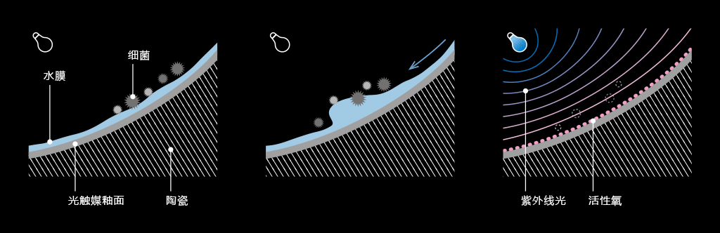 通过紫外线光照和釉药产生光触媒反应,由周围的氧气和水分子生成活性氧。活性氧可以有效分解并减少污垢、细菌的产生。